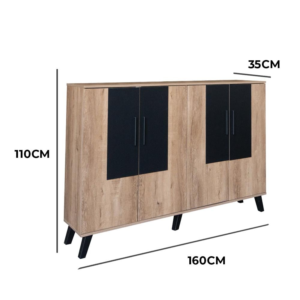 تتميز خزانة الأحذية بلونها الخشبي والأسود الرائع، مع قاعدة متينة تضفي مظهرًا عصريًا وجذابًا يتناسب مع أي ديكور داخلي، كما أنها مصنوعة من مواد عالية الجودة تضمن المتانة والاستخدام اليومي المريح.