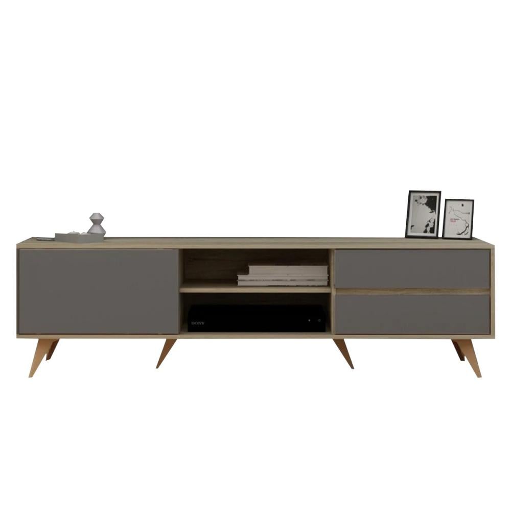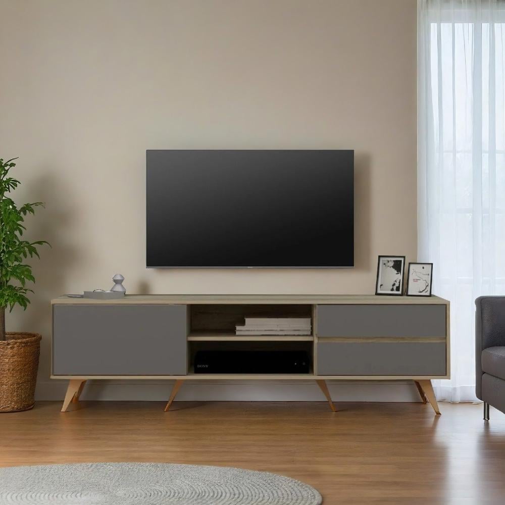ارتقِ بأناقة غرفة المعيشة مع طاولة تلفزيون مودرن تجمع بين الخشب الطبيعي واللون الرمادي العصري، لتمنح منزلك مظهرًا راقيًا يجمع بين الحداثة والدفء.